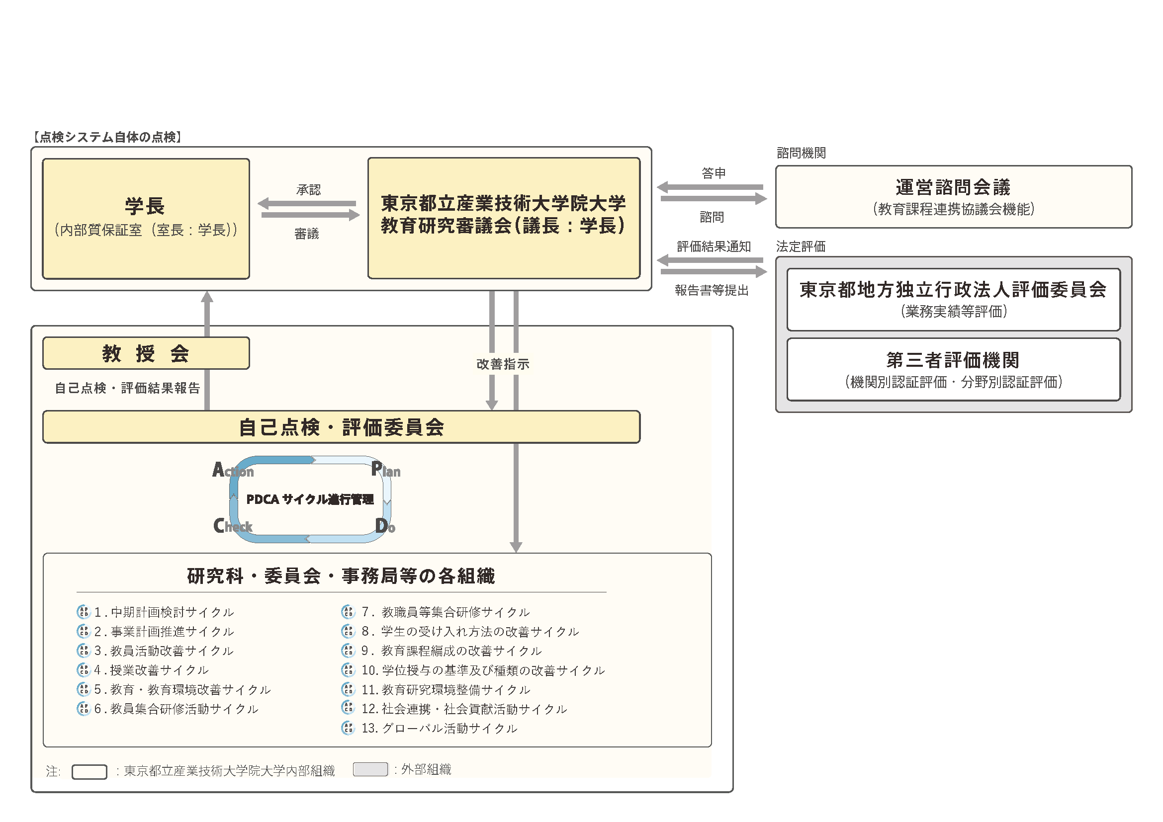 本学は、本学の教育・研究、組織・運営及び施設・設備の状況について継続的に点検並びに評価することで、質の保証を行い、絶えず改善に取り組むために、内部質保証システムを構築しています。