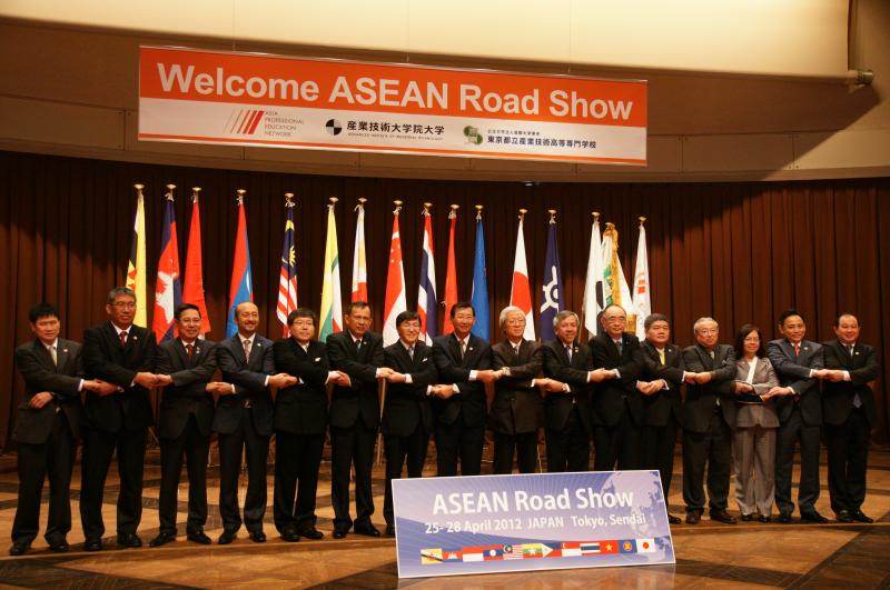 4月27日(金)、ASEAN10か国の経済閣僚等及びASEAN事務局が、産業技術大学院大学(AIIT)及び都立産業技術高等専門学校(TMCIT)を視察しました。これはASEAN経済閣僚が日本の政官財界と意見交換を行うために来日した「ASEANロードショー」の一環として、国際組織APEN(Asia Professional Education Network)の呼びかけに応じて実現したものです。