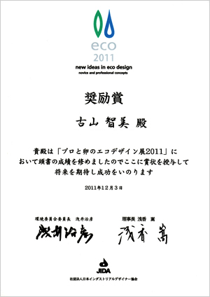 本学の創造技術専攻の学生(1年 古山智美さん)が社団法人日本インダストリアルデザイナー協会主催の 「プロと卵のエコデザイン展2011」で奨励賞を受賞しました。