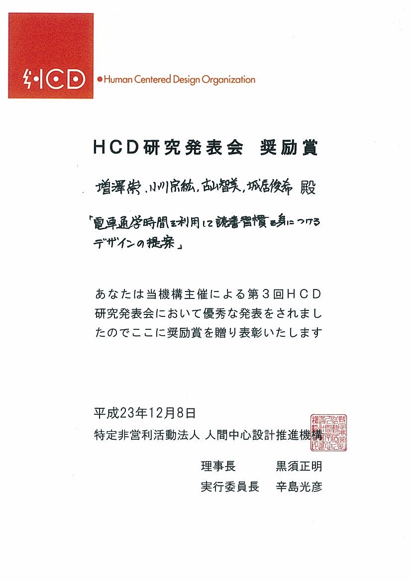 本学学生が「HCD研究発表会」で奨励賞を受賞しました。