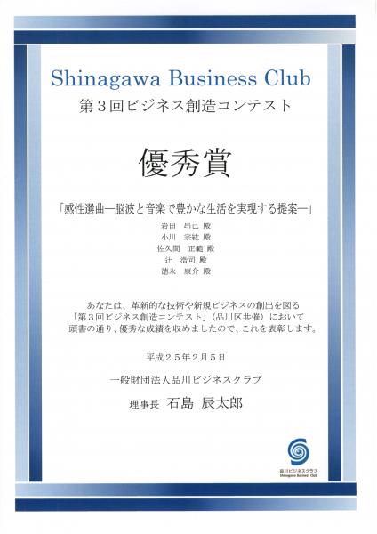 本学の創造技術専攻、越水PT(創造技術専攻2年 岩田昂己さん、小川宗紘さん、佐久間正範さん、辻浩司さん、徳永康介さん)によるPBL活動の成果が、品川ビジネスクラブが主催する「第3回ビジネス創造コンテスト」にて、優秀賞を受賞しました。