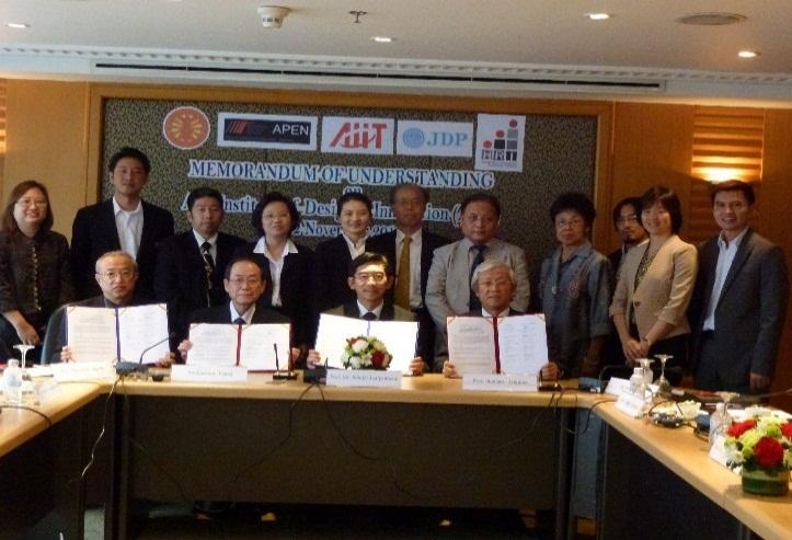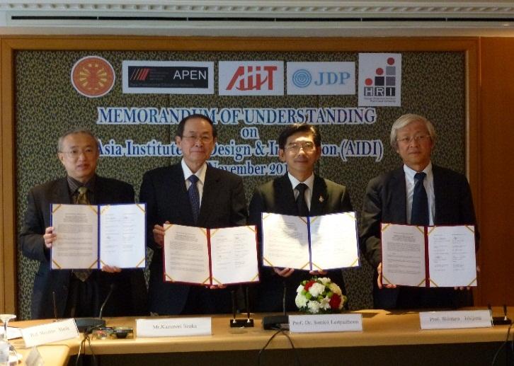 11月12日(火)、タイのタマサート大学において、本学、APEN、タマサート大学及び(公財)日本デザイン振興会の4者間で、産業デザイン及びイノベーション分野における高度専門職人材育成に向け、タマサート大学人材センター内にAsia Institute of Design and Innovation(AIDI)を設立するため覚書(MOU)を締結しました。