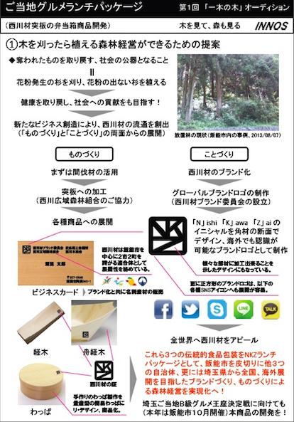 このプレゼンテーションは、昨年10月26日に実施された”「一本の木」オーディション”(主催:「一本の木」オーディション実行委員会、共催:飯能商工会議所、西川広域森林組合、他、後援:飯能市、飯能ケーブルテレビ、飯能信用金庫、他)にてプラン部門のファイナリストに選定されたことを受け、西川広域森林組合長(兼オーディション実行副委員長)ご同席のもとで実現したものです。