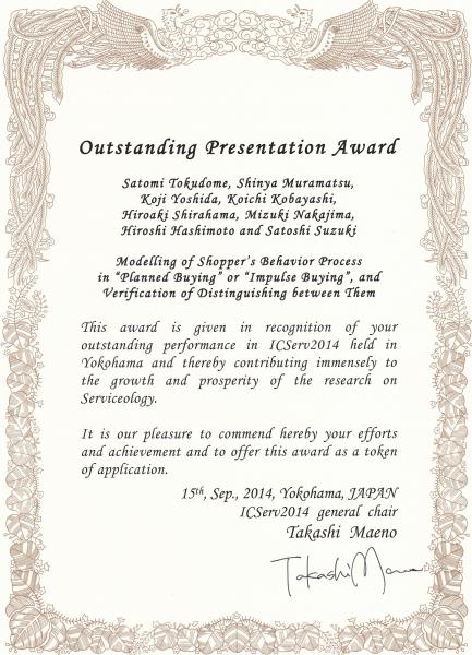 本学修了生が、サービス科学に関わる国際学会ICServ2014(サービス学会主催)で発表し、Outstanding Presentation Awardを受賞しました。 2014年9月16日 本学修了生(H25年度、創造技術専攻) 徳留里美氏が、サービス科学に関わる国際学会ICServ2014(サービス学会主催)で発表し、Outstanding Presentation Awardを受賞されました。本発表は、H23年度橋本プロジェクトメンバー全員と担当の中島瑞季助教らにより作成されたもので、購買意欲の推定に関する研究成果です。 Tweet Check