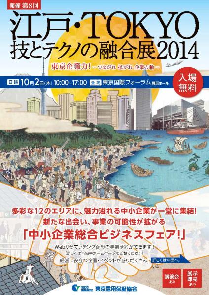 「江戸・TOKYO 技とテクノの融合展」に本学が出展します。 2014年9月17日 「江戸・TOKYO 技とテクノの融合展」に本学が出展し、情報アーキテクチャ専攻、創造技術専攻、オープンインスティテュート(OPI)など、本学の取り組みを紹介します。 【江戸・TOKYO 技とテクノの融合展2014】日時:平成26年10月2日(木)10:00~17:00会場:東京国際フォーラム 展示ホール(産技大ブース:L-1)詳細:東京信用保証協会 江戸・TOKYO 技とテクノの融合展2014http://www.cgc-tokyo.or.jp/fair/outline.html Tweet Check
