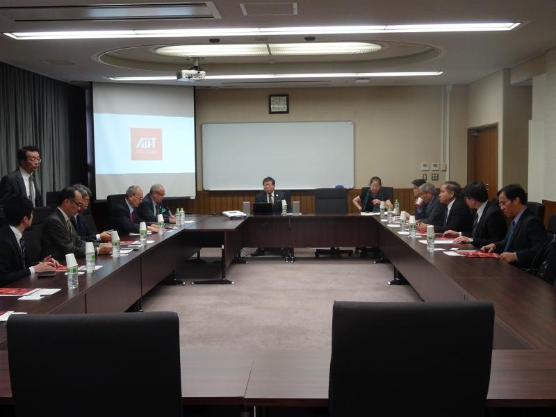 4月19日、JICAの招聘によりラオス国立大学長及びラオス日本センター関係者、5名が本学に来訪されました。本学では川田学長、前田教授、佐々木特任教授が対応し、高度産業人材育成について説明、意見交換が行われました。招聘されたラオスの2機関は、ラオスの「ビジネス人材の育成と交流の拠点」としての機能を強化していくことが期待されており、参加者は熱心な議論、視察を行いました。