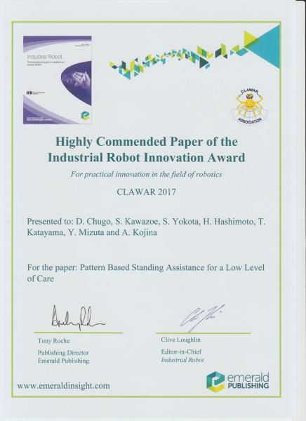 本学創造技術専攻 橋本洋志教授が国際ロボット学会CLAWAR2017で、福祉介護ロボットに関する研究発表を行い、Highly Commended Paper of the Industrial Robot Innovation Awardを受賞しました。