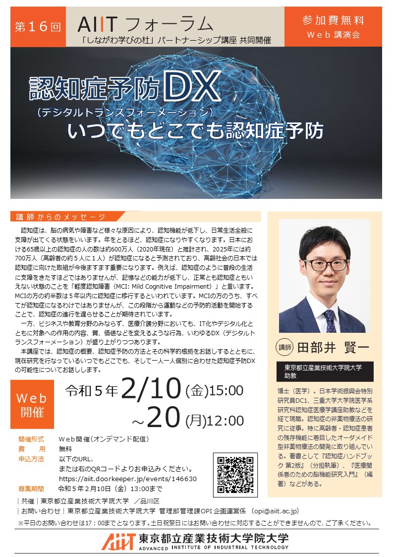 東京都立産業技術大学院大学では、どなたでも自由に参加できる公開講座「AIITフォーラム」の次回開講を2月に予定しています。今回は「しながわ学びの杜」と本学のパートナーシップ講座として開催します。
