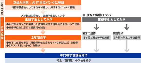 AIIT単位バンク制度と正規学生としての学修を組み合わせることにより、事実上、7年間に及ぶ長期間の履修が可能となります(長期履修制度と併せると最大8年間)。