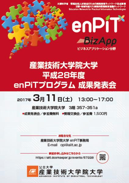「産業技術大学院大学 平成28年度 enPiTプログラム 成果発表会」を開催します。(2017年3月11日)