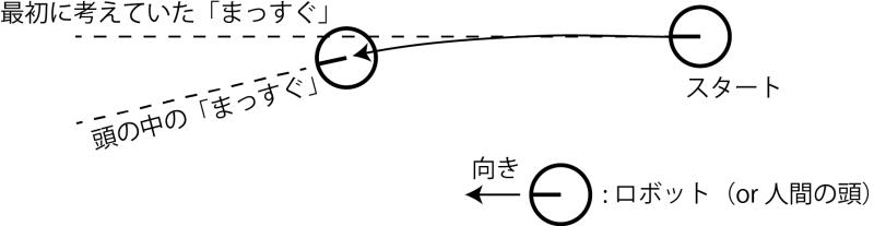 まず、ちゃんと算数を使ってまっすぐ走らない理由を書きます。 そもそも、ロボットも人間もそうなのですが、 身体というのは完全に対称なものではありません。 重心はどちらかに偏っています。 筆者の通っている整体の先生によると、 人間の脚の長さも左右でずれている人が多いそうです。
