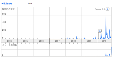最近、Wikipedia類似のWikiLeaks(http://www.wikileaks.org/ 、2006年12月~)という、政府・企業・宗教等の機密情報を収集・公開することを目的としたサイトが話題にあがることが多い。名前から類推できるように、Wikipediaと同じMediaWikiという実装を使っている。WikiLeaksサイトの運営は2006年12月頃から始まったが、最近、アフガニスタン戦争関連の機密情報(7月25日)、イラク戦争の米軍機密情報(10月22日)、米国外交機密文書(11月28日)等が公開され、あっという間に大衆が存在を知りうる状態と成った(図1はGoogle Trendからの引用参照)。尖閣諸島沖での中国漁船衝突映像がYoutubeに登録され、物議を醸す出来事があったが、WikiLeaksでは、過激で巧妙であり、参加者(告発者)の匿名性を高めるための工夫、政府等からの関与を回避するための工夫が行われている。サイト自体は米国外にあるため、米国政府が手出しすることも出来無い。まさにインターネットに情報が公開されるというのはこういうことであるという見本である。
