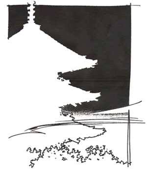 それは、背景に松の樹を描き加えた時だった。指先が感じたその線の勢い、というよりも渋滞感はまるで五重塔を描いているようであった。樹木の葉の一枚一枚が嵐にも堪え、幹や枝から落葉することがないように、五重塔が倒壊することなく千年余の嵐に耐えてきたことは、境界層における空気の渦に注目すれば納得できること。これまでの定説である地震に堪える構造的な理由を超えてそのジグザグの凹凸線に秘密があるのではと考えるに至った。