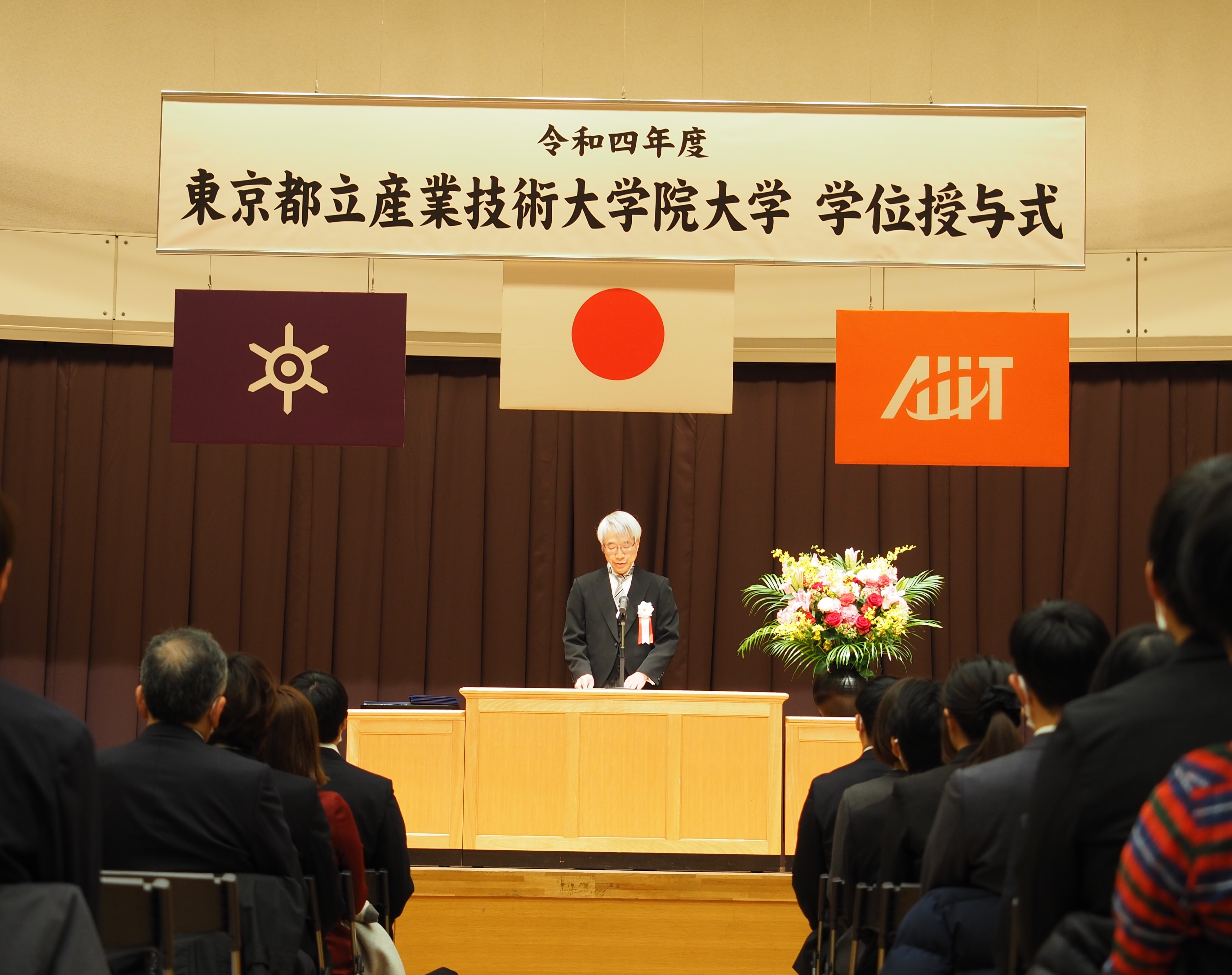 東京都立産業技術大学院大学を修了される皆さん、修了、誠におめでとうございます。東京都公立大学法人、および、本学の教職員ともども皆さんの学位授与を心からお祝い申し上げます。また、皆さんをこれまで、支えてこられた、ご家族や関係者の皆さまに、心からお祝い申し上げます。
